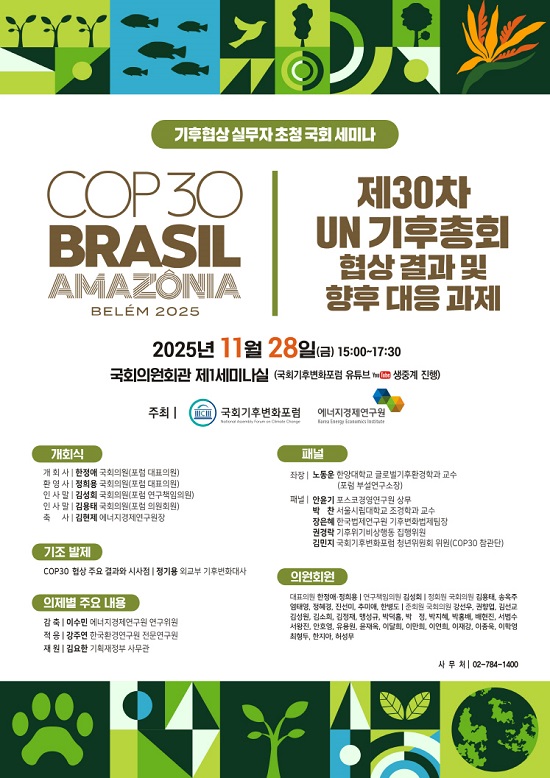 ¹ü±¹¹ÎÀûÀÎ ±âÈĺ¯È ´ëÀÀÀ» À§ÇÑ ÀÔ¹ý·Á¤Ã¥ °Å¹ö³Í½º¸¦ ÁöÇâÇÏ´Â ±¹È¸±âÈĺ¯ÈÆ÷·³(´ëÇ¥ÀÇ¿ø ÇÑÁ¤¾Ö·Á¤Èñ¿ë)Àº ¿À´Â 28ÀÏ Á¦30Â÷ À¯¿£±âÈĺ¯ÈÇù¾à ´ç»ç±¹ÃÑȸ(COP30)ÀÇ ´ëÇѹα¹ Á¤ºÎ´ëÇ¥´ÜÀ» ÃÊûÇÏ¿©‘COP30 Çù»ó °á°ú ¹× ÇâÈÄ ´ëÀÀ °úÁ¦’¸¦ ÁÖÁ¦·Î ¼¼¹Ì³ª¸¦ °³ÃÖÇÑ´Ù.