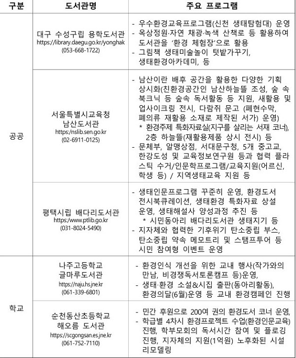 Á¤ºÎ ¹× ÇÐ°è µî °ü·Ã Àü¹®°¡ 10ÀÎÀÌ °¢ µµ¼°ü(ÃÑ 37°÷ ÀÀ¸ð)ÀÇ ¡âģȯ°æ ÀνÄ, ¡âȯ°æÁÖÁ¦ ¹®ÈÇà»ç, ¡âÁö¿ª»çȸ Çù·Â·À¯´ë(°ø°ø), ¡â±³³»¿Ü ¿¬°èȰµ¿(Çб³) ¡âÁö¼Ó°¡´É¼º, ¡â¿ì¼öȯ°æµµ¼ Ȱ¿ë µî °¡Á¡À» Æò°¡ÇÏ¿© ÃÖÁ¾ 5°÷À» ±âÈÄȯ°æ±³À° ¿ì¼öµµ¼°üÀ» ¼±Á¤Çß´Ù.