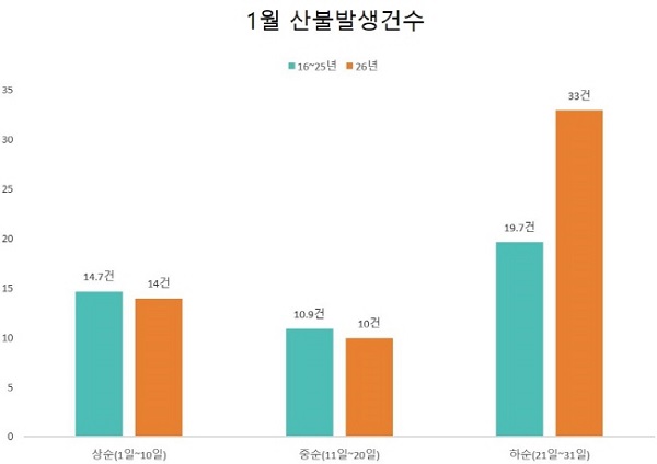 ƯÈ÷ 1¿ù »êºÒÀÇ ¾à 57.8%(33°Ç)°¡ Çϼø(21~31ÀÏ)¿¡ ÁýÁßÀûÀ¸·Î ¹ß»ýÇߴµ¥, Áö³ 29ÀÏ¿¡´Â ÇÏ·ç¿¡¸¸ 10°ÇÀÇ »êºÒÀÌ ¹ß»ýÇϸç, ÃÖ±Ù 10³â Áß 1¿ù ‘ÀÏ ÃÖ´Ù »êºÒ ¹ß»ý’ 2À§¸¦ ±â·ÏÇϱ⵵ Çß´Ù.
