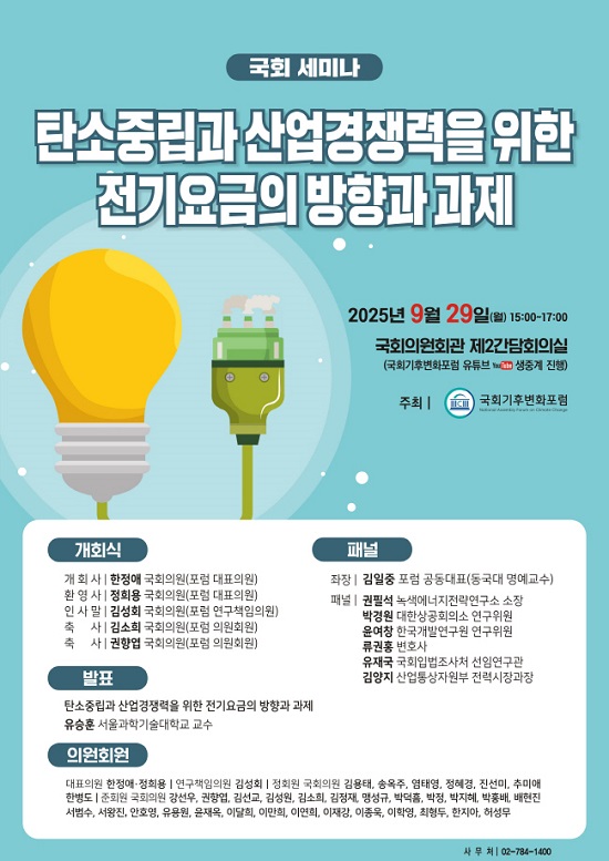 ¹ü±¹¹ÎÀûÀÎ ±âÈĺ¯È ´ëÀÀÀ» À§ÇÑ ÀÔ¹ý·Á¤Ã¥ °Å¹ö³Í½º¸¦ ÁöÇâÇÏ´Â ±¹È¸±âÈĺ¯ÈÆ÷·³(´ëÇ¥ÀÇ¿ø ÇÑÁ¤¾Ö·Á¤Èñ¿ë)Àº ¿À´Â 29ÀÏ ‘ź¼ÒÁ߸³°ú »ê¾÷°æÀï·ÂÀ» À§ÇÑ Àü±â¿ä±ÝÀÇ ¹æÇâ°ú °úÁ¦’¸¦ ÁÖÁ¦·Î ±¹È¸ ¼¼¹Ì³ª¸¦ °³ÃÖÇÑ´Ù.