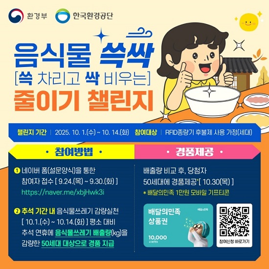 ȯ°æºÎ »êÇÏ Çѱ¹È¯°æ°ø´Ü(ÀÌ»çÀå ÀÓ»óÁØ)Àº Ãß¼® ¿¬ÈÞ¸¦ ¸Â¾Æ À½½Ä¹°¾²·¹±â °¨·®À» À§ÇØ 10¿ù 1ÀϺÎÅÍ 14ÀϱîÁö 2ÁÖ°£ ‘Ãß¼® ¸íÀý À½½Ä¹° ¾³½Ï(¾³ Â÷¸®°í ½Ï ºñ¿ì´Â) ÁÙÀ̱⒠Çà»ç(縰Áö)¸¦ ÁøÇàÇÑ´Ù°í ¹àÇû´Ù.