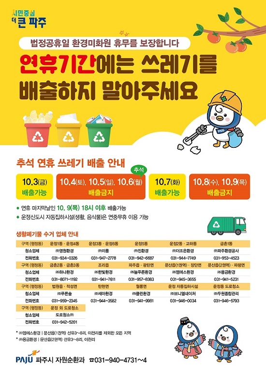 ÆÄÁֽô ȯ°æ¹ÌÈ¿ø ÈÞ¹« º¸ÀåÀ» À§ÇØ Ãß¼® ¿¬ÈÞ ±â°£ÀÎ 10¿ù 4ÀϺÎÅÍ 10¿ù 6ÀÏ, 10¿ù 8ÀϺÎÅÍ 10¿ù 9ÀϱîÁö´Â »ýȰÆó±â¹°À» ¹èÃâÇØ¼´Â ¾È µÇ¸ç, ÀÌ ±â°£ µ¿¾È¿¡´Â »ýȰ¾²·¹±â ¼ö°Å°¡ Áß´ÜµÈ´Ù°í ¹àÇû´Ù.