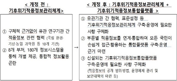 À̹ø ½ÃÇà·É °³Á¤¿¡ µû¶ó ±âÁ¸ ±â»óÁ¤º¸°ü¸®Ã¼°è¸¦ ÀÌ»ó·±ØÇѱâÈÄ ´ëÀÀü°èÀÎ ±âÈÄÀ§±â °¨½Ã¿¹Ãø °ü¸®Ã¼°è·Î È®´ëÇϰí, ±â°üº°·Î Èð¾îÁ®ÀÖ´Â ÀûÀÀ Á¤º¸¸¦ ‘±âÈÄÀ§±â ÀûÀÀÁ¤º¸ ÅëÇÕ Ç÷§Æû’ ³»¿¡¼ ÀÏ¿øÈÇÏ¿© °ü¸®ÇÒ ¼ö ÀÖµµ·Ï Çß´Ù.