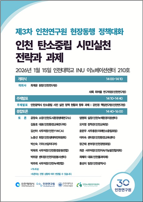 ÀÎõ¿¬±¸¿ø(¿øÀå ÃÖ°è¿î)Àº ÀÎõ´ëÇб³ RISE»ç¾÷´Ü, ÀÎõ³ì»öȯ°æÁö¿ø¼¾ÅÍ¿Í ÇÔ²² ¿À´Ã(15ÀÏ) ¿ÀÈÄ 2½Ã, ÀÎõ´ëÇб³ INU À̳뺣À̼Ǽ¾ÅÍ 210È£¿¡¼ Á¤Ã¥Åä·Ðȸ¸¦ °øµ¿ °³ÃÖÇÑ´Ù.