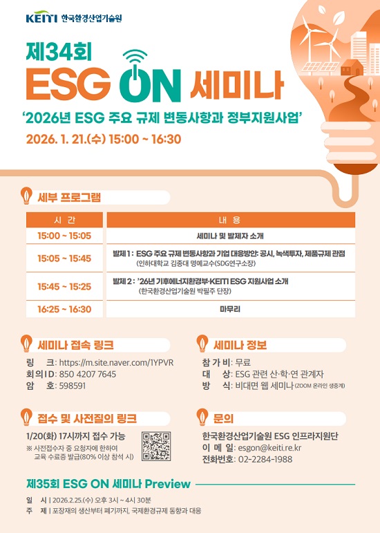 Çѱ¹È¯°æ»ê¾÷±â¼ú¿øÀº 1¿ù 21ÀÏ ¿ÀÈÄ 3½Ã ȯ°æ·»çȸ·Åõ¸í°æ¿µ(ESG) ±ÔÁ¦ÀÇ ÇÙ½É º¯µ¿ »çÇ×°ú ±âÈÄ¿¡³ÊÁöȯ°æºÎ ¹× Çѱ¹È¯°æ»ê¾÷±â¼ú¿øÀÇ Á¤ºÎ Áö¿ø»ç¾÷À» ¼Ò°³ÇÏ´Â ‘Á¦34ȸ ÀÌ¿¡½ºÁö(ESG) ¿Â(ON) ¼¼¹Ì³ª’¸¦ ¿Â¶óÀÎÀ¸·Î °³ÃÖÇÑ´Ù.