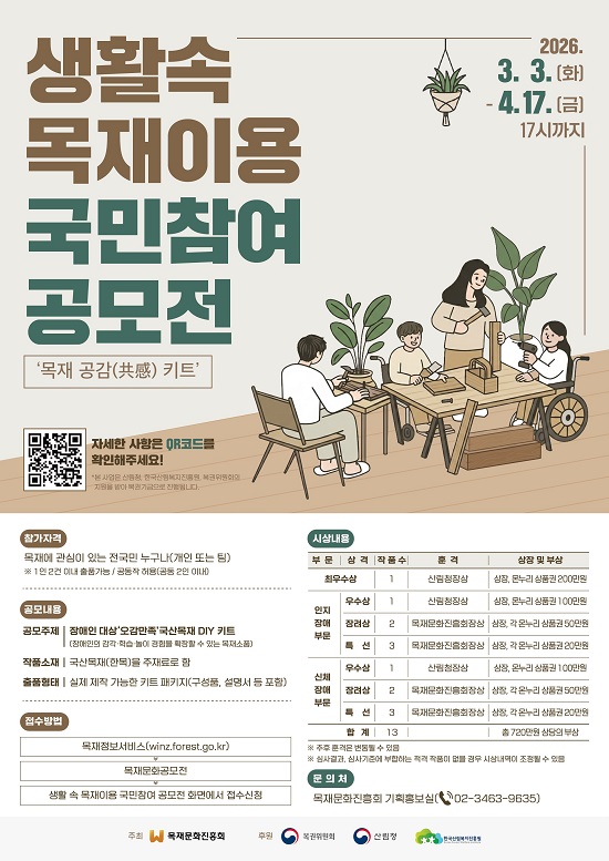 ¸ñÀç¿¡ °ü½ÉÀÌ ÀÖ´Â ±¹¹ÎÀ̶ó¸é ´©±¸³ª Âü¿©ÇÒ ¼ö ÀÖÀ¸¸ç, 4¿ù 17ÀÏ ¿ÀÈÄ 5½Ã±îÁö, »ê¸²Ã» ¸ñÀçÁ¤º¸¼ºñ½º ´©¸®Áý(winz.forest.go.kr) ‘»ýȰ ¼Ó ¸ñÀçÀÌ¿ë ±¹¹ÎÂü¿© °ø¸ðÀü’ ¸Þ´º¸¦ ÅëÇØ ¿Â¶óÀÎÀ¸·Î Á¢¼ö°¡ °¡´ÉÇÏ´Ù.