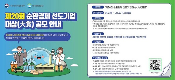 ±âÈÄ¿¡³ÊÁöȯ°æºÎ »êÇÏ Çѱ¹È¯°æ°ø´Ü(ÀÌ»çÀå ÀÓ»óÁØ)Àº Æó±â¹° °¨·®°ú ¼øÈ¯ÀÌ¿ë, ÀçȰ¿ë Ȱ¼ºÈ·Î Áö¼Ó°¡´ÉÇÑ ¼øÈ¯°æÁ¦»çȸ Àüȯ¿¡ ±â¿©ÇÑ ±â¾÷À» ¹ß±¼Çϱâ À§ÇØ ‘Á¦20ȸ ¼øÈ¯°æÁ¦ ¼±µµ±â¾÷ ´ë»ó’ °ø¸ð¸¦ ½Ç½ÃÇÑ´Ù.