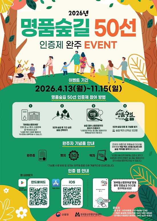 »ê¸²Ã»(ûÀå ¹ÚÀº½Ä)Àº ½£±æÀ» Ȱ¿ëÇÑ ±¹¹ÎÀÇ ¿©°¡ Ȱ¼ºÈ ¹× Áö¿ª°æÁ¦ Ȱ¼ºÈ¸¦ À§ÇØ ‘2026³â ¸íǰ½£±æ 50¼± ¿ÏÁÖ ÀÎÁõÁ¦’¸¦ 11¿ù 15ÀϱîÁö ¿î¿µÇÑ´Ù°í 13ÀÏ ¹àÇû´Ù.
