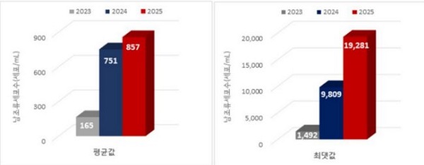 ¿¬±¸¿øÀÇ ÃÖ±Ù 3³â°£(2023³â~2025³â) °Ë»ç °á°ú¿¡ µû¸£¸é ³²Á¶·ù ¼¼Æ÷¼öÀÇ Æò±Õ°ª°ú ÃÖ´ñ°ªÀÌ Áö¼ÓÀûÀ¸·Î ´Ã¾î³µÀ¸¸ç, ƯÈ÷ Áö³ÇØ¿¡´Â Á¶·ù°æº¸ °ü½É´Ü°è ±âÁØ(20,000 ¼¼Æ÷/mL)¿¡ ±ÙÁ¢ÇÑ ¼öÁرîÁö µµ´ÞÇß´Ù.