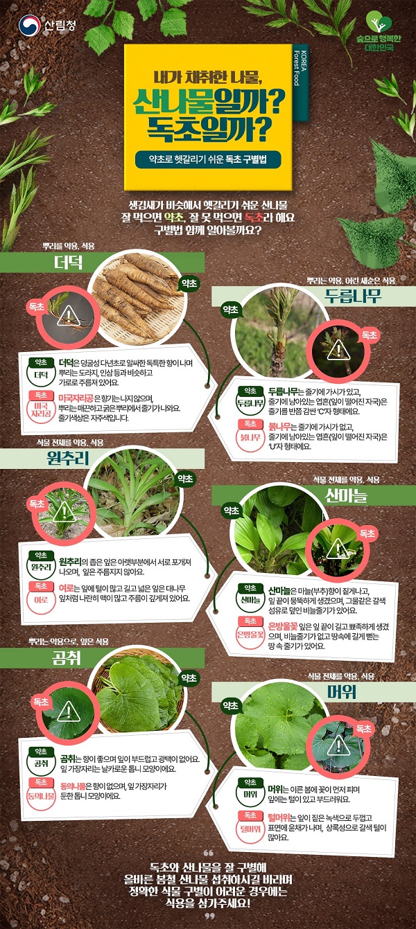 Âü°í·Î »ê³ª¹°°ú µ¶Ãʸ¦ ±¸º°ÇÏ´Â µ¿¿µ»ó Á¤º¸´Â ½Ä¾àó À¯Æ©ºê(¾ÈÀüÇÑ »ê³ª¹° äÃë‧¼·Ãë °¡À̵å)¿¡¼ È®ÀÎÇÒ ¼ö ÀÖÀ¸¸ç, µ¶ÃÊ¿¡ ´ëÇÑ ÀÚ¼¼ÇÑ Á¤º¸´Â »ê¸²Ã» ±¹¸³¼ö¸ñ¿ø ´©¸®Áý(http://kna.forest.go.kr) ¿¬±¸°£Ç๰¿¡ °Ô½ÃµÈ º½, °¡À» µ¶¼º ½Ä¹°¿¡ ´ëÇÑ °¡À̵åºÏ¿¡¼ È®ÀÎÇÒ ¼ö ÀÖ´Ù.